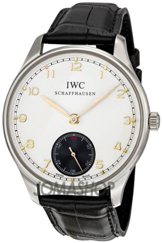 Stainless steel case with a black croco-embossed leather strap. Fixded stainless steel bezel. White dial with rose gold hands and Arabic numeral hour markers. Minute markers around the outer rim. Seconds sub-dial above the 6 o'clock position. Manual winding movement. Scratch resistant sapphire crystal. Skeleton case back. Case diameter: 44 mm. Tang clasp. Water resistant at 30 meters / 100 feet. Functions: hours, minutes, seconds. IWC Portuguese Manual Winding Mens Watch IW545405.